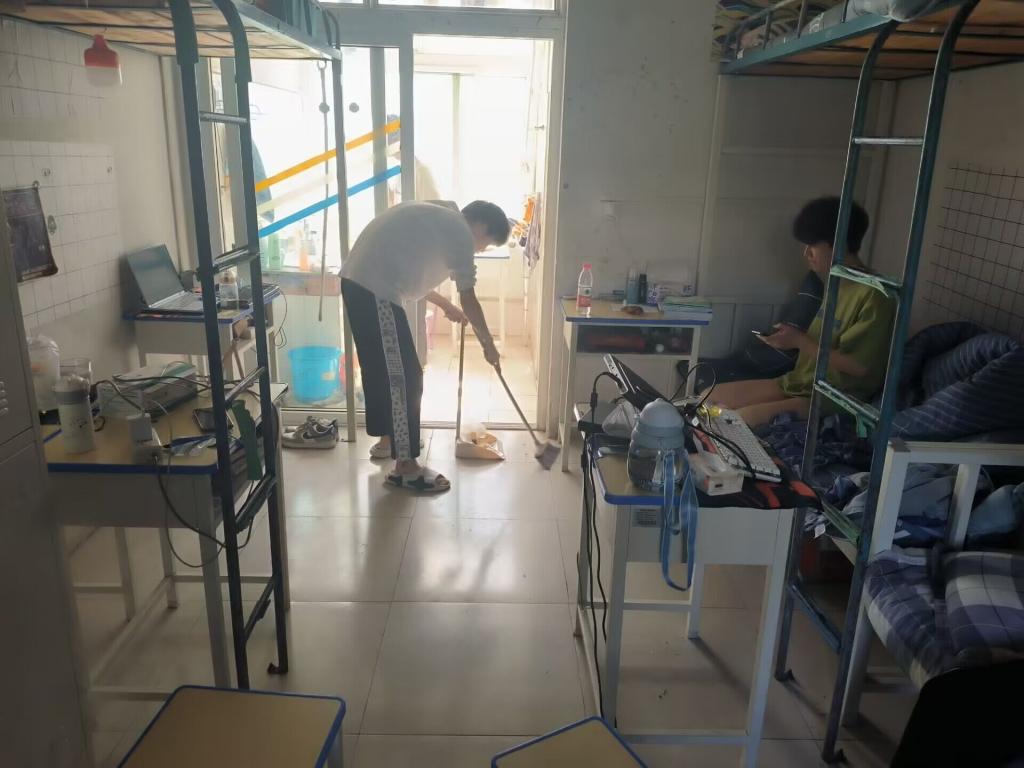 同学们在接到打扫的通知后便积极投入到大扫除活动当中,寝室长分配任务,说干就干,每个同学都热情高涨,撸起袖子便投身到宿舍的清理工作中来。