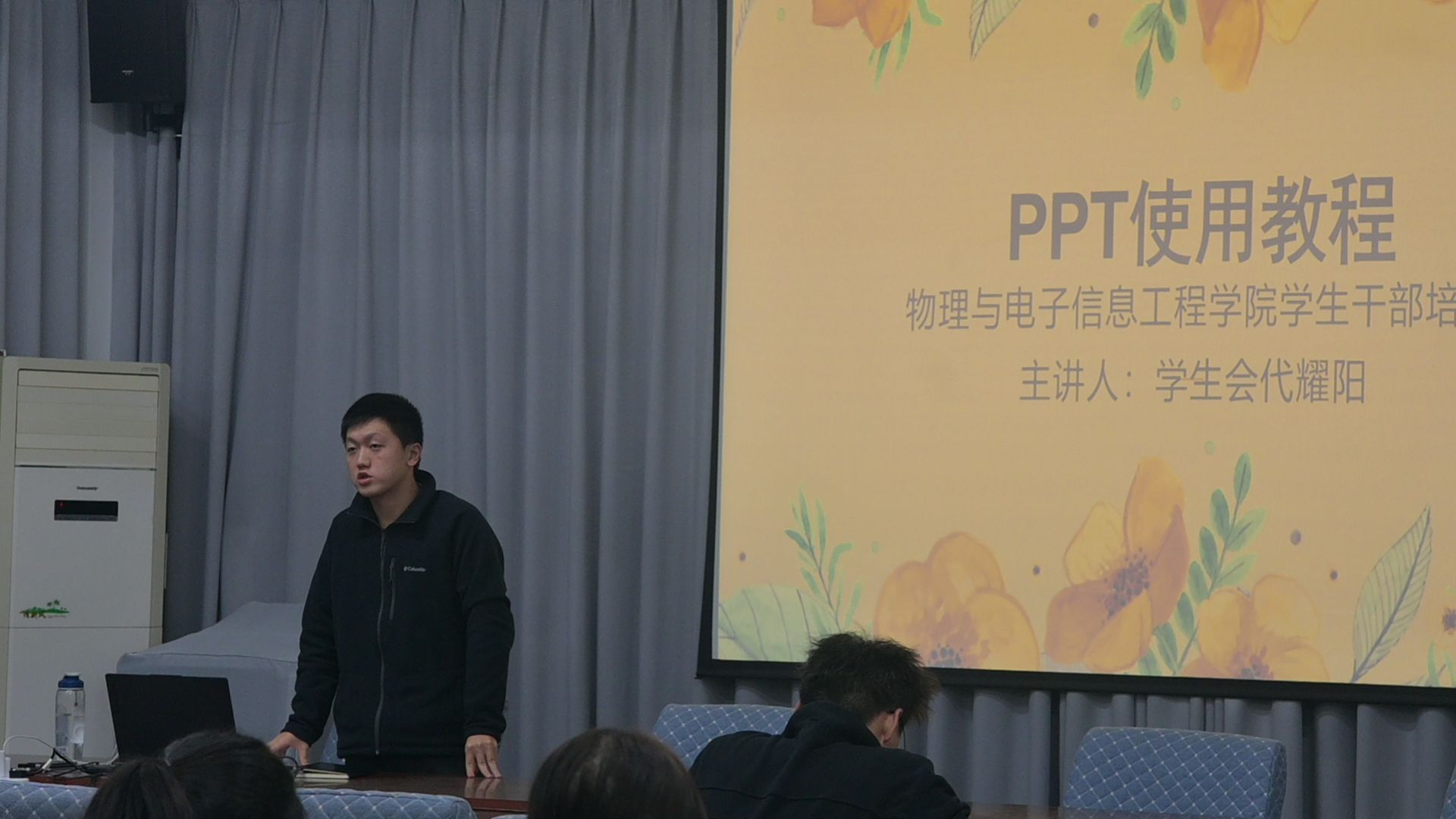 第三场培训由物电学院学生会主席团成员代耀阳同学担任主讲人,聚焦于 Word、Excel 办公技能以及 PPT 制作。在 Word 模块,重点讲解了策划案的撰写方法、格式刷的巧妙应用以及表格填写的规范要求,让学生干部们能够更加规范、高效地完成各类文档撰写工作。Excel 模块则通过实际演示,展示了基础计算功能的使用方法,尤其突出了 VLOOKUP 函数在数据处理中的实用价值,帮助同学们掌握高效的数据处理技巧。PPT 模块针对文字堆砌、配色不当等五大常见问题,传授了切实可行的优化技巧,同时明确了海报制作需包含的活动、地点、对象等核心要素,使学生干部们能够制作出更加专业、美观的 PPT 和海报。