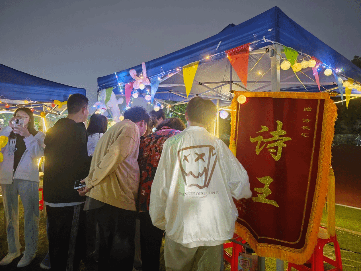活动当天,夜幕降临,华灯初上,操场内的夜市摊位逐渐热闹起来。各式各样的摊位琳琅满目,有碎片成诗、有蒙眼挑战、还有射击气球。同学们纷纷驻足观赏,流连忘返。