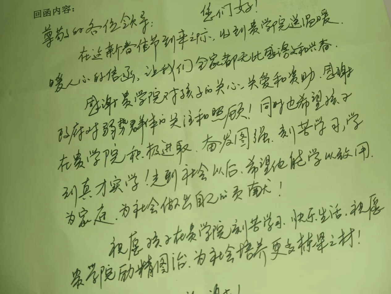 此次回函活动不仅加深了学校、学院与家长之间的联系,也进一步彰显了学院对学生的关怀与期望。相信在学校、学院与家庭的共同努力下,这些获得国家助学金的学生一定能够在未来的道路上越走越远,成为社会的栋梁之才。