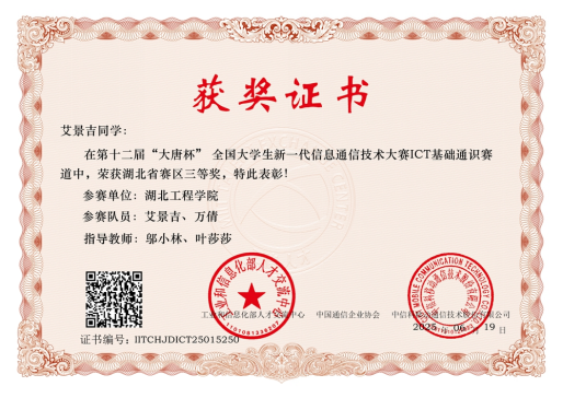 6月28日第十二届“大唐杯”全国大学生新一代信息通信技术大赛区域赛,我院学生初次参赛,一支队伍经过初选获得三等奖。“大唐杯”全国大学生新一代信息通信技术大赛是由工业和信息化部人才交流中心、中国通信企业协会主办的全国性创新实践型竞赛。大赛自2014年创办以来,已连续成功举办十二届,累计吸引上千所院校、超过16万名学生参与,是信息通信领域影响力广泛、规模领先的权威赛事。
