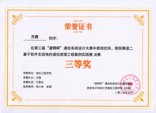 5 月 16 日至 18 日,第三届“凌特杯”通信系统设计大赛全国总决赛在西安电子科技大学举办,我院学生初次参赛,一支队伍经过初选以一等奖闯入决赛,获得全国三等奖。 “凌特杯”通信系统设计大赛为通信领域的人才培养与创新实践画上了浓墨重彩的一笔。本次大赛以“创新驱动、协同育人”为核心理念,设置无线通信系统设计赛和基于软件无线电的通信原理工程案例实践赛两大特色赛道,全面考察参赛学生的理论基础、工程实践和创新能力。大赛共吸引来自全国206所高校的3152名学子同台竞技,参赛规模创历史新高,展现出通信专业教育的蓬勃活力与深厚底蕴。