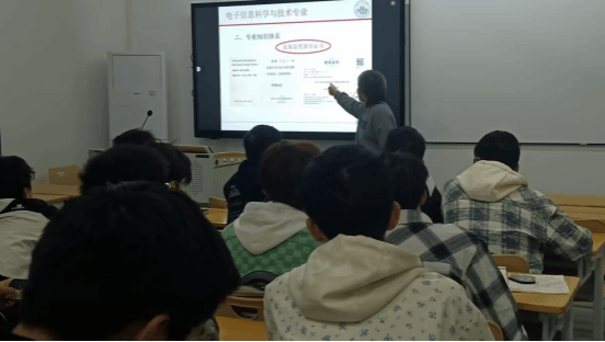 电子信息工程专业负责人方天红老师重点介绍了该专业作为电子、信息与计算机等交叉融合的专业特色,以及我院在电子信息控制和信息处理领域的优势与特色,强调了其在电子设备与信息系统设计、开发、应用和集成方面的重要性。方老师还展示了该专业的教学团队和优秀基层教学组织,增强了新生对专业教学实力的信心。