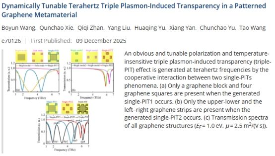 近日,williamhill中国王波云副教授团队发表在国际著名期刊《International Journal of Quantum Chemistry》的论文“Dynamically tunable terahertz triple plasmon-induced transparency in a patterned graphene metamaterial, 2025, 125(24): e70126”被遴选为2025年第125卷24期的期刊封面论文(Front Cover)。