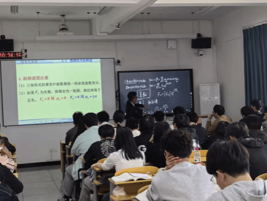 为了让学生们更好地掌握频谱分析技巧,李老师结合精心制作的PPT内容,详细演示了振幅频谱图、相位频谱图以及单边频谱图和双边频谱图的绘制方法。他通过一系列具体且贴近工程实际的例题,如求解周期信号f(t)的基波周期T、基波角频率Ω,并指导学生亲手绘制其单边频谱图,引导学生们逐步深入频谱分析的世界,感受信号处理的魅力。这些例题不仅加深了学生们对理论知识的理解,更激发了他们对信号处理领域的浓厚兴趣与探索欲望,为未来的工程实践打下了坚实的基础。