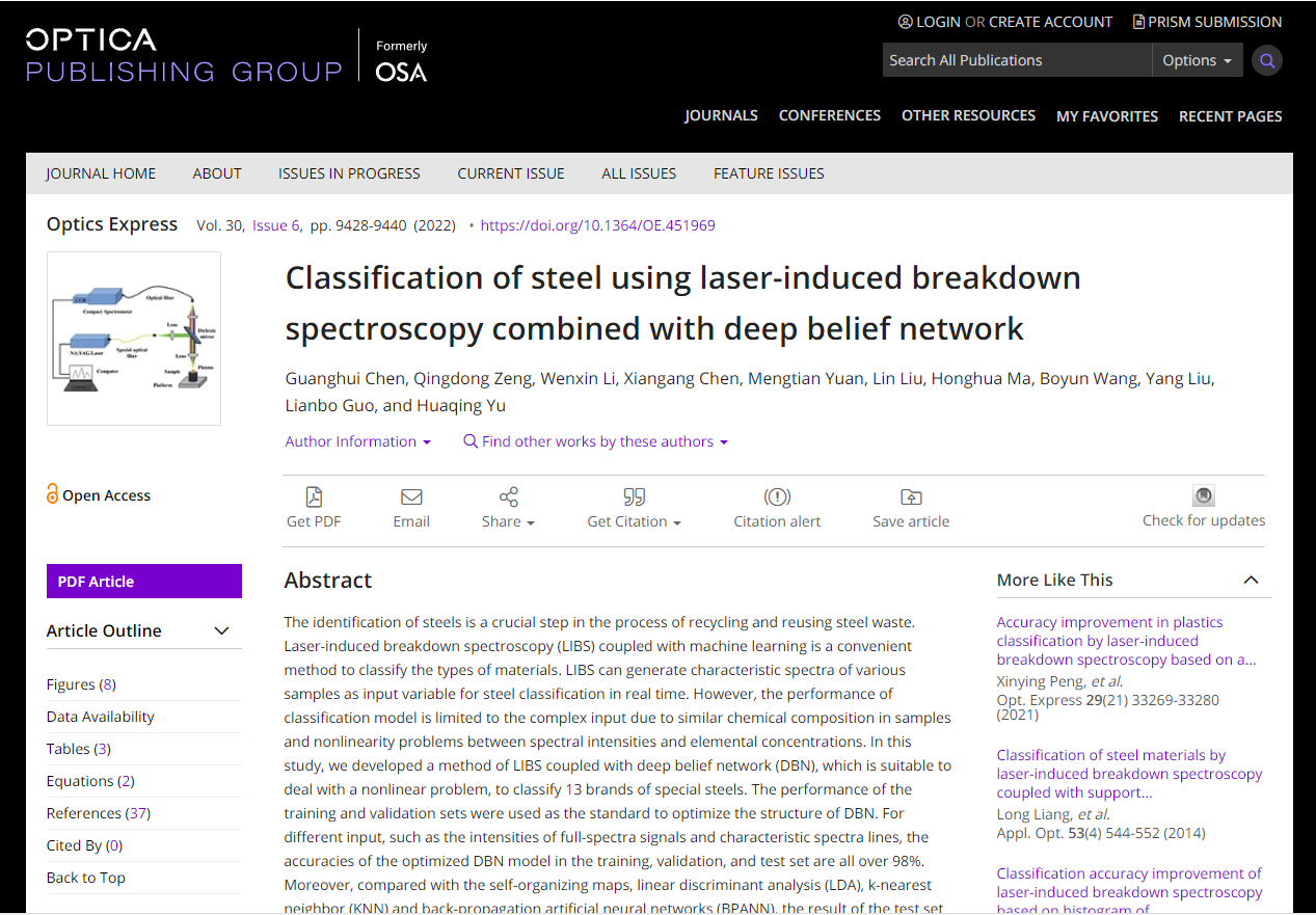 该论文第一作者为我院与湖北大学联合培养研究生陈光辉(导师:曾庆栋、余华清)。文章以“Classification of steel using laser-induced breakdown spectroscopy combined with deep belief network”为题,在激光诱导击穿光谱(Laser-induced Breakdown Spectroscopy,LIBS)技术基础上,将受限玻尔兹曼机(Restricted Boltzmann Machines, RBM)及其串联叠加构成的深度信念网络(Deep Belief Network,DBN)算法对LIBS钢铁样本光谱数据的进行分类识别,给出了一种基于机器学习算法与LIBS技术相结合的特钢检测与分类模型,为工业现场实时快速检测与分类提供了一种新的有效途径。文章的顺利发表,彰显了我院在激光诱导击穿光谱领域的研究达到了国际领先水平,同时,也体现了我院研究生培养质量再迈新台阶。