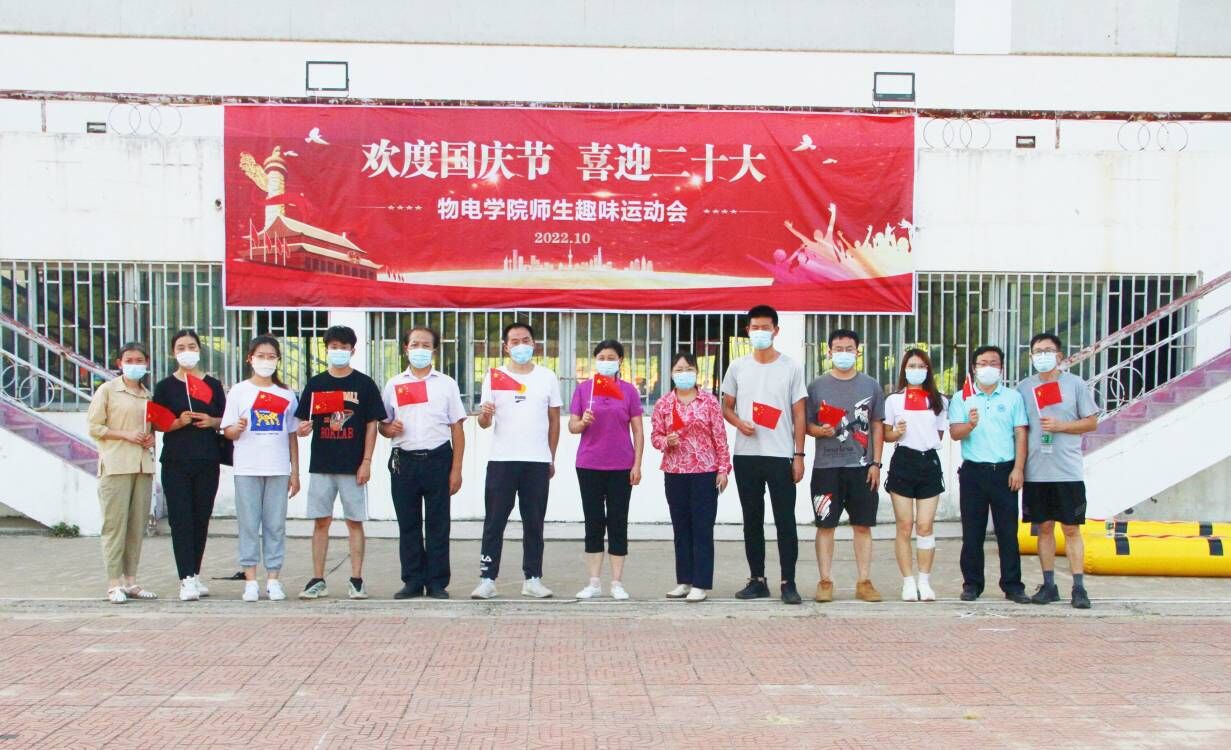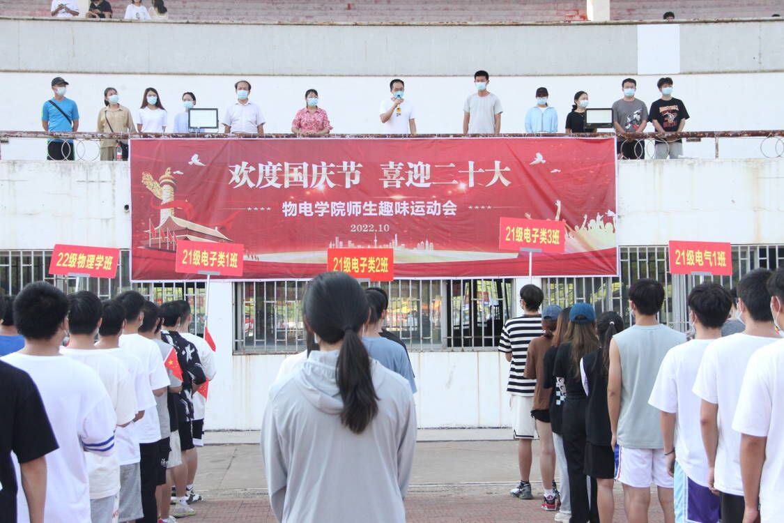 本网讯 10月1日下午,我院在东区运动场举办了以“欢乐度国庆 喜迎党的二十大”为主题的师生趣味运动会。来自全院的近150名运动员齐聚一堂,享受了一场其乐无穷的“体娱盛宴”。院长余华清、党总支书记来秀明、副院长周传璘、党总支副书记金文豪出席开幕式。