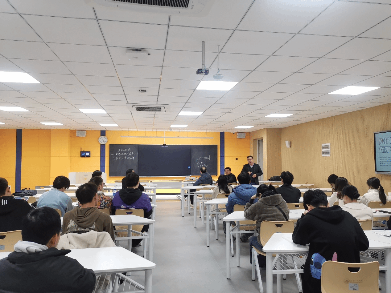 物电学院于11月28日下午在三园区2栋410教室成功举办了2020级师范生实习总结暨讲课验收活动。此次验收活动特邀广水一中高级教师唐章盟、丁萍、张新国、李中平指导,副院长李钱光、物理系竞赛负责人陈知红与2020级和2021级物理学班学生一同参与。活动由物理系主任聂长江主持。