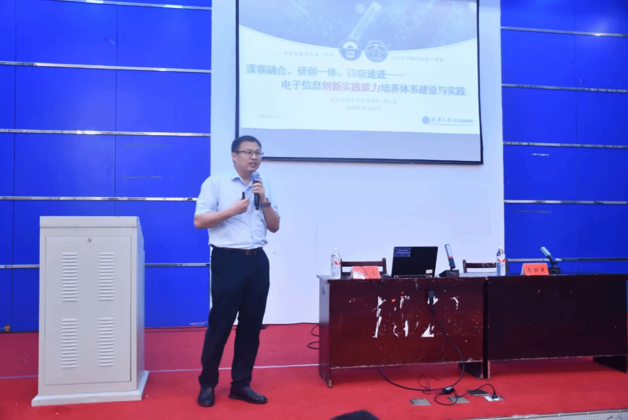 5月25日上午,武汉大学周立青高级工程师在williamhill中国学术报告厅做题为“课赛融合、研创一体、四级递进——电子信息创新实践能力培养体系建设与实践”的专题报告。物电学院部分教师和电子类专业学生参加报告会。报告会由物电学院副院长李钱光主持。