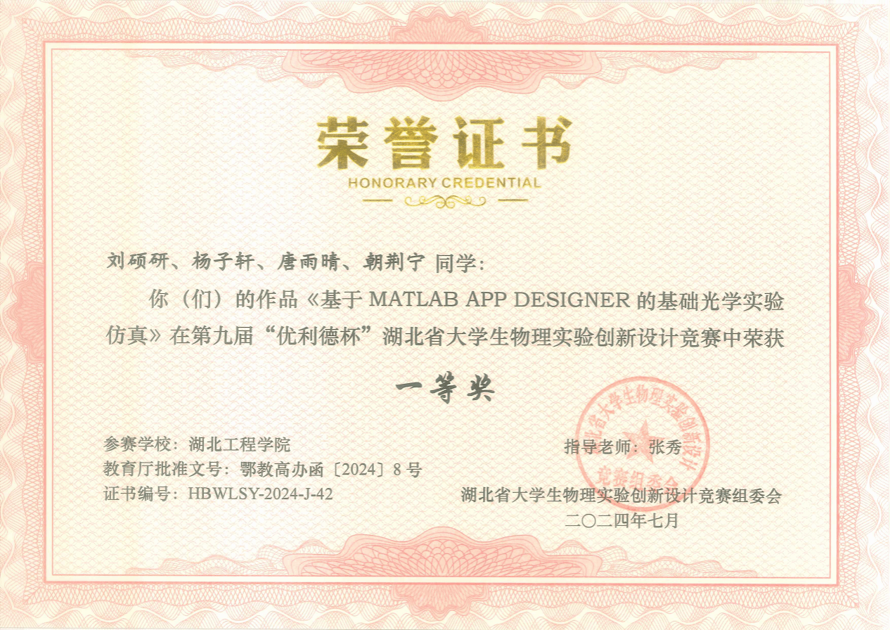 7月13日至15日,第九届湖北省大学生物理实验创新设计竞赛在华中师范大学举行,我院派出9支队伍参赛,获得一等奖和二等奖各1项;三等奖6项;优秀奖1项。此次竞赛我院仿真类、自选类、讲课类和命题类均有获奖,其中仿真类,由刘硕研,杨子轩,唐雨晴,朝荆宁等同学设计的《基于MATLAB APP DESIGNER 的基础光学实验仿真》获省一等奖,将直通在11月份举行的2024年全国大学生物理实验创新设计竞赛决赛。