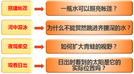 通过旅行中搭建帐篷,内部昏暗,无法阅读,提出问题一:一瓶水能照亮帐篷吗?。自制暗室,顶部开孔,待放入水瓶,学生在内部体验放入水瓶前后的变化。对比效果明显,激发学生强烈学习兴趣。提出问题:光在不同种介质中如何传播?