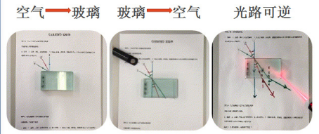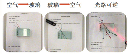 本节课重点实验采用底部贴有胶带的平行玻璃砖进行,仪器虽然简单,但是通过巧妙的设计,可以进行空气射入玻璃,玻璃射入空气,光路可逆三个层次的探究,得出折射规律水到渠成。