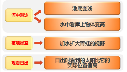 透过水观察岸上的物体变高,发散思维,日出时透过大气看到的太阳是它的实际位置吗?将光的传播介质由不同介质转移到同种不均匀介质。用底部带孔的直角弯管将浓盐水注入清水底部,在浓盐水和清水的交界面处,水不再均匀,当光在不均匀的水中传播时,不再沿直线传播,同样发生了折射。